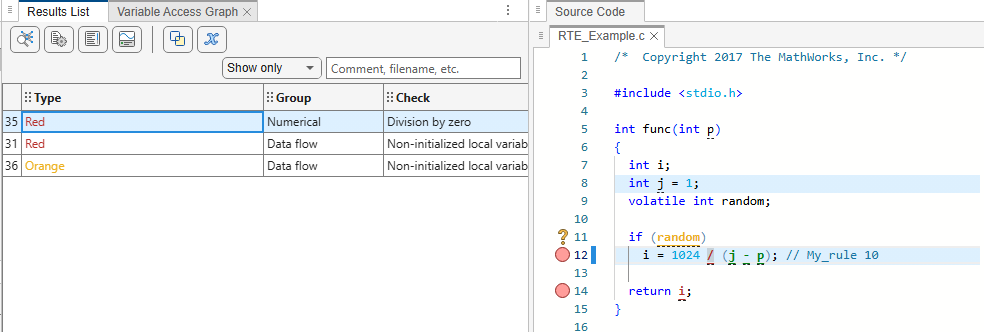 The code comment My_rule 10 does not use the Polyspace annotation syntax. Instead, you use a convention where you place runtime errors in a single numbered list. In this list, rule Division by zero (Polyspace Code Prover) corresponds to 10.You can check this code for runtime errors by typing the command: