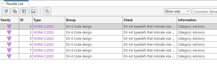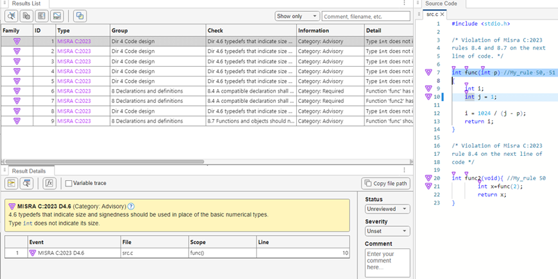 The code comments My_rule 50, 51 and My_rule 50 do not use the Polyspace annotation syntax. Instead, you use a convention where you place all MISRA™ rules in a single numbered list. In this list, rules 8.4 and 8.7 correspond to the numbers 50 and 51.You can check this code for MISRA C: 2023 violations by typing the command: