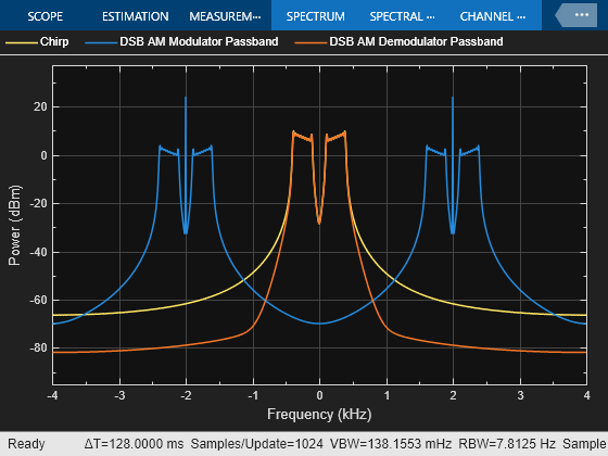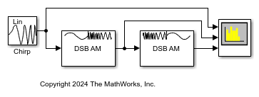 The DSB AM Modulator Passband block modulates a signal using double-sideband amplitude modulation.