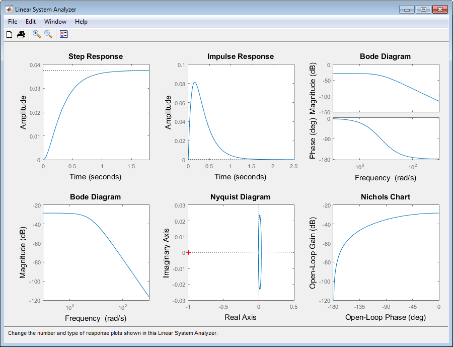 Available response plots include: step, impulse, Bode (magnitude and phase, or magnitude only), Nyquist, Nichols, sigma, pole/zero maps, and I/O pole/zero maps.