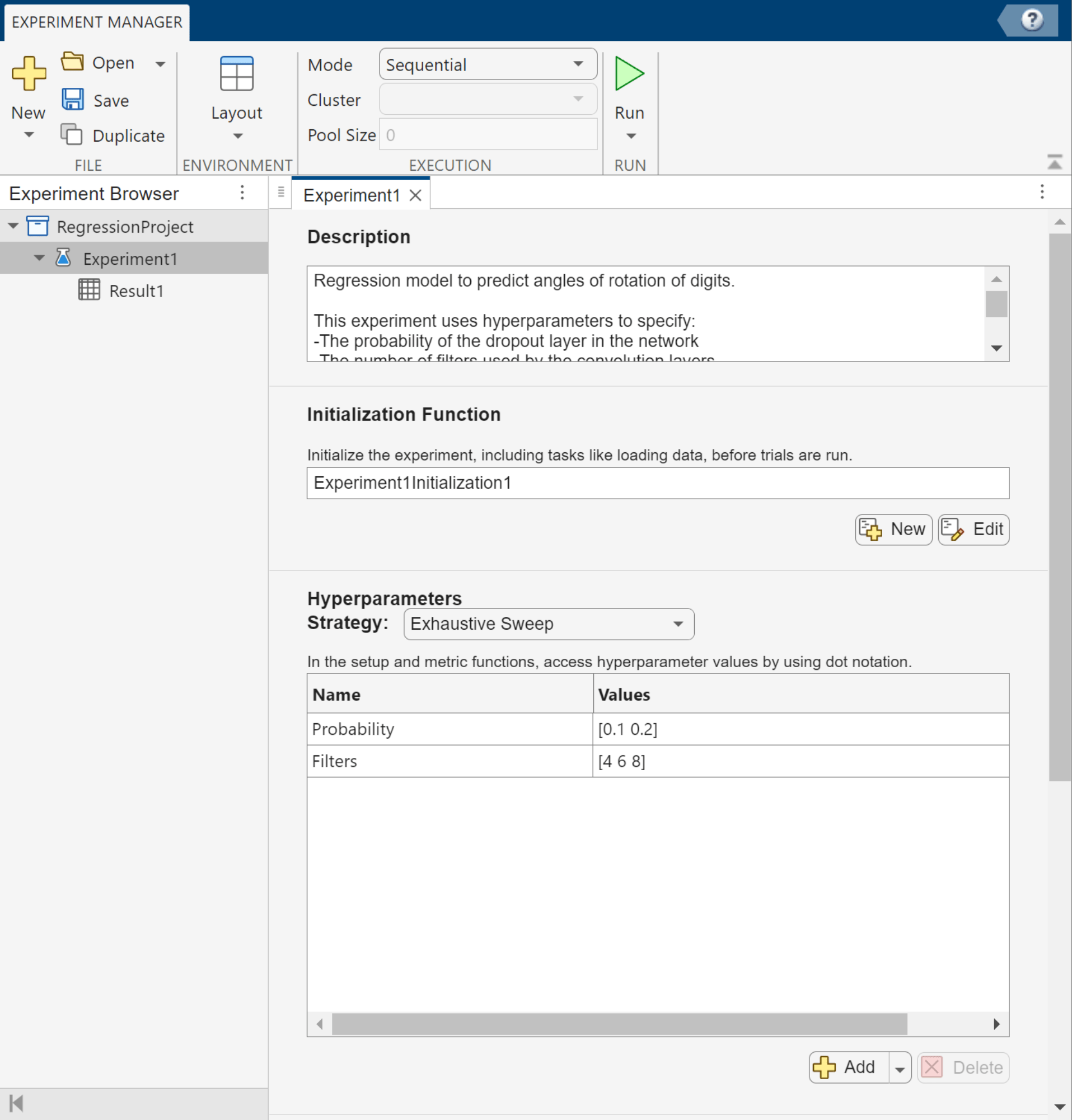 When you run the experiment, if the Exhaustive Sweep strategy is selected, Experiment Manager trains the model using every combination of the specified hyperparameter values. Alternatively, if you have Statistics and Machine Learning Toolbox™, you can access additional strategies for optimizing hyperparameters. For more information, see Choose Strategy for Exploring Experiment Parameters.