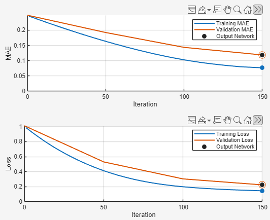 To train the model, click Train. The Training Progress document displays the mean square error (MSE) loss and mean absolute error (MAE) of the model.