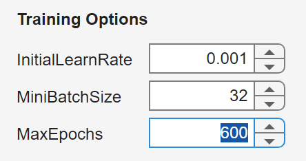 In the Summary tab of the new copy of the model, set MaxEpochs to 600. Train the model.