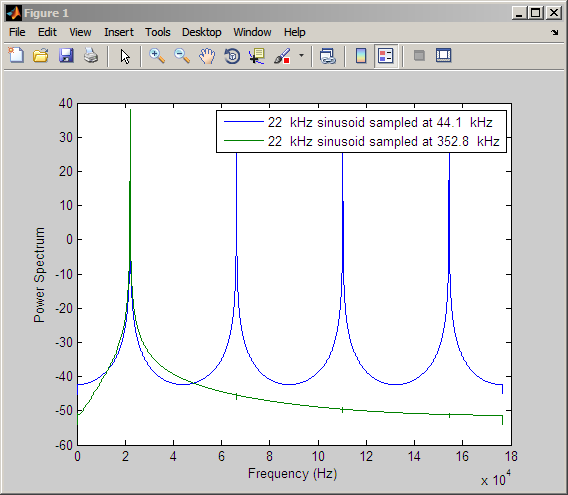 l = 8; % Interpolation factor hm = mfilt.fftfirinterp(l); % We use the default filter n = 8192; % Number of points hm.blocklength = n; % Set block length to number of points fs = 44.1e3; % Original sample freq: 44.1 kHz. n = 0:n-1; % 0.1858 secs of data x = sin(2*pi*n*22e3/fs); % Original signal, sinusoid at 22 kHz y = filter(hm,x); % Interpolated sinusoid xu = l*upsample(x,8); % Upsample to compare--the spectrum % does not change [px,f]=periodogram(xu,[],65536,l*fs);% Power spectrum of original % signal [py,f]=periodogram(y,[],65536,l*fs); % Power spectrum of % interpolated signal plot(f,10*log10(([fs*px,l*fs*py]))) legend('22 kHz sinusoid sampled at 44.1 kHz',... '22 kHz sinusoid sampled at 352.8 kHz') xlabel('Frequency (Hz)'); ylabel('Power Spectrum');