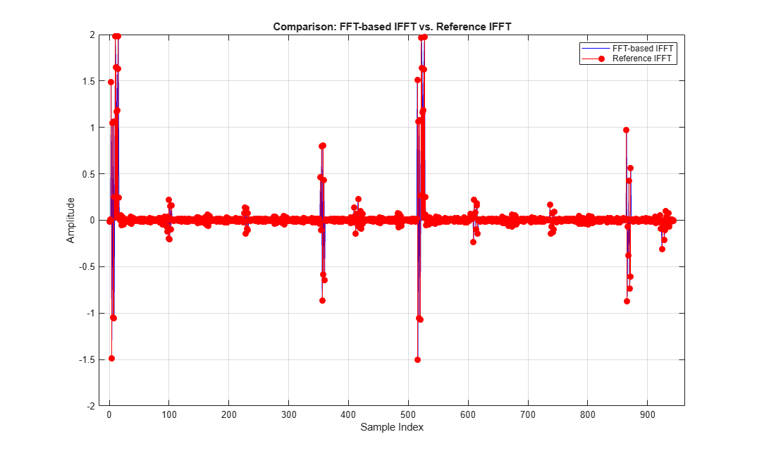 validDataRef = squeeze(refOut(:,:,refValidOut)); figure; plot(real(IFFTOutput(:)),'b'); % Blue line for IFFTOutput hold on; stem(real(validDataRef(:)),'r','filled','Marker','o'); xlabel('Sample Index'); ylabel('Amplitude'); title('Comparison: FFT-based IFFT vs. Reference IFFT'); legend('FFT-based IFFT','Reference IFFT'); grid on; hold off;