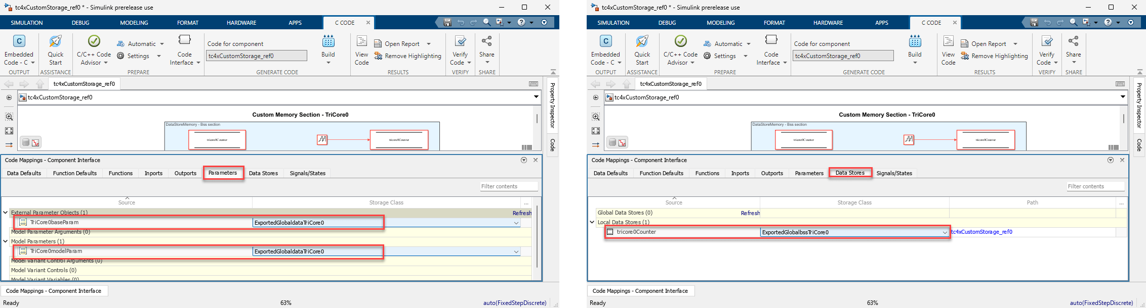 To control the appearance of data in the generated code and to prevent optimizations from eliminating individual data elements, configure the storage class for parameters and datastores using the Code Mappings editor. This example configures the parameters and datastores individually as separate global variables by mapping them to the custom storage classes ExportedGlobaldataTriCore0 and ExportedGlobalbssTriCore0, respectively. These custom storage classes are provided with the aurixmemorydemospkg package.