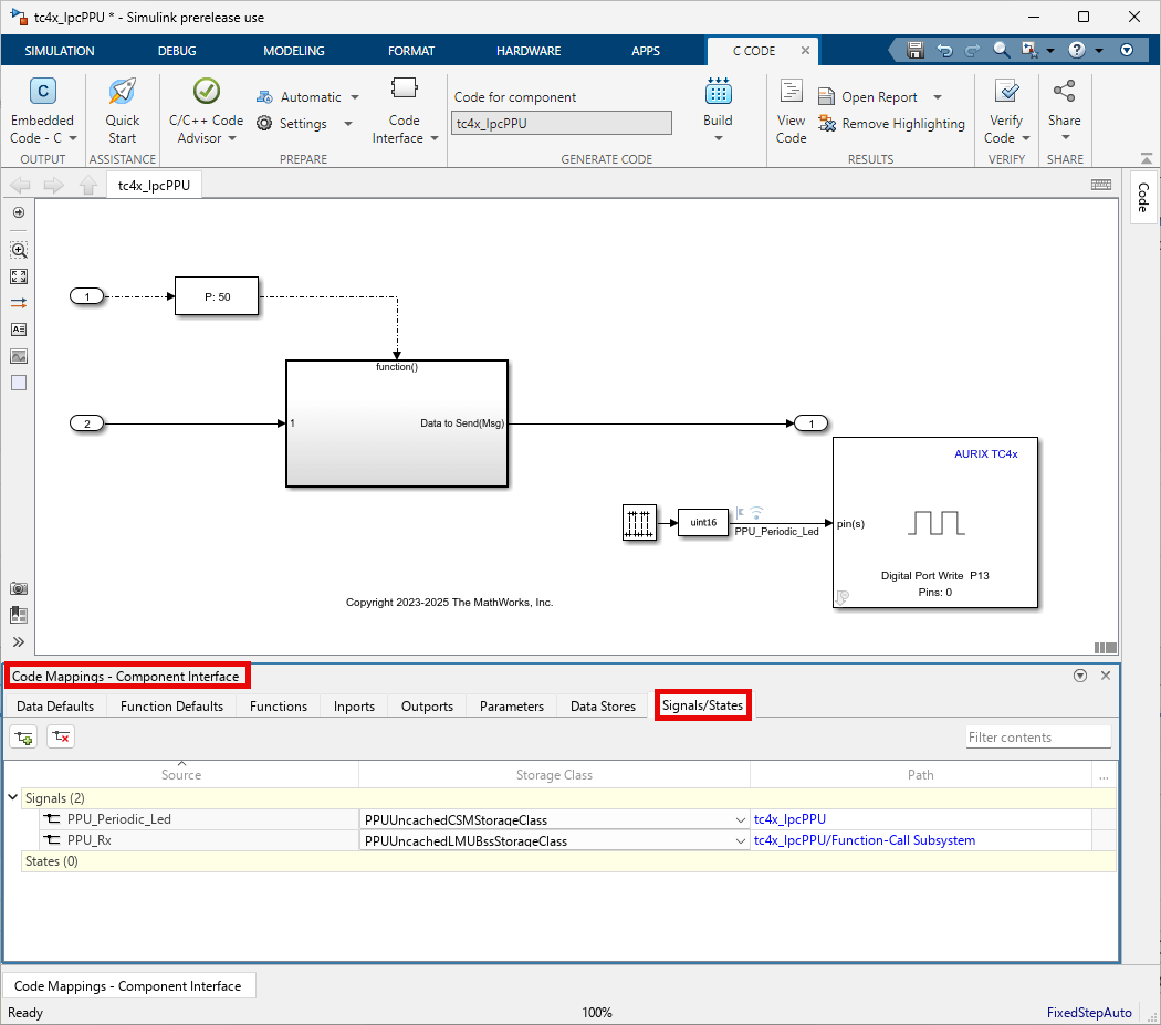 This example shows how to use the parallel processing unit (PPU) of Infineon AURIX TC4x Microcontrollers to generate optimized code. It also shows how to configure the custom storage class and memory sections to control the placement of code and data in the memory of PPU. PPU is a specialized hardware accelerator that you can use to speed up the highly parallel vector computations.