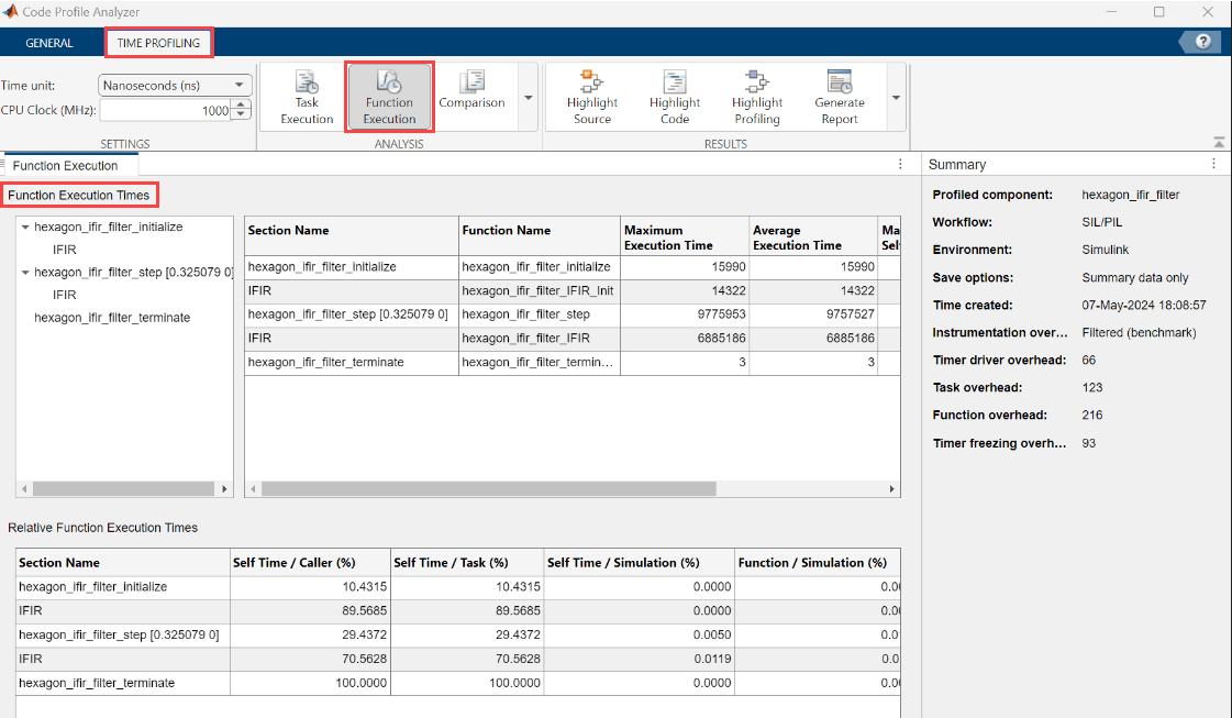 In the Function Execution Times pane, verify the Maximum and Average Execution time for the Discrete FIR Filter block and Math Operations. You can consider the average execution time for the whole simulation.