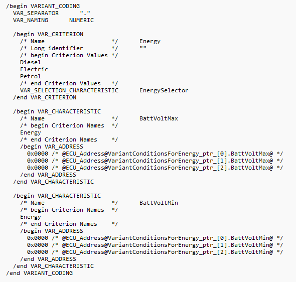 This example shows how to generate a variant coding section in an ASAP2 (A2L) file. A variant coding section in an ASAP2 file contains the variant criterion and variant selection characteristics.