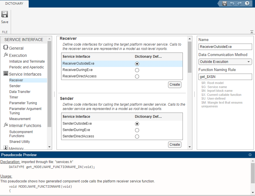 3. Under Service Interface, select Receiver. The Embedded Coder Dictionary shows content in three panes. Use the left pane to navigate through the dictionary configurations. The center pane lists the interfaces that are defined in a code interface configuration for the item you select in the navigation pane. From the center pane you can create and delete interfaces and specify a default interface. The right pane shows the property settings for the interface selected in the center pane. The Pseudocode Preview updates as you change property settings.