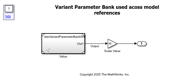 • The top-level model slexVariantParameterBankMdlRef contains a Gain block named Scale Value that uses a variant parameter SCALE_FACTOR to set the Gain parameter value. SCALE_FACTOR is defined as a Simulink.VariantVariable object in the data dictionary topBankedVariantParameterData.sldd.