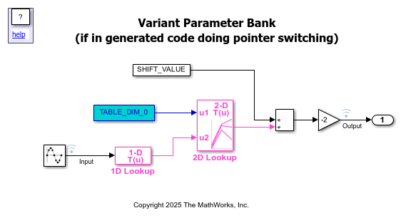 • The model slexVariantParameterBankWithSLDD contains multiple blocks that use variant parameters defined in the data dictionary bankedVariantParameterData.sldd. The values of the Constant parameters of the two Constant blocks in the model are set to the variant parameter objects SHIFT_VALUE and TABLE_DIM_0. The Table data and Breakpoint sets of the n-D Lookup Table blocks are specified using the variant parameter objects T1Break, T1Data, T2Break, and T2Data.