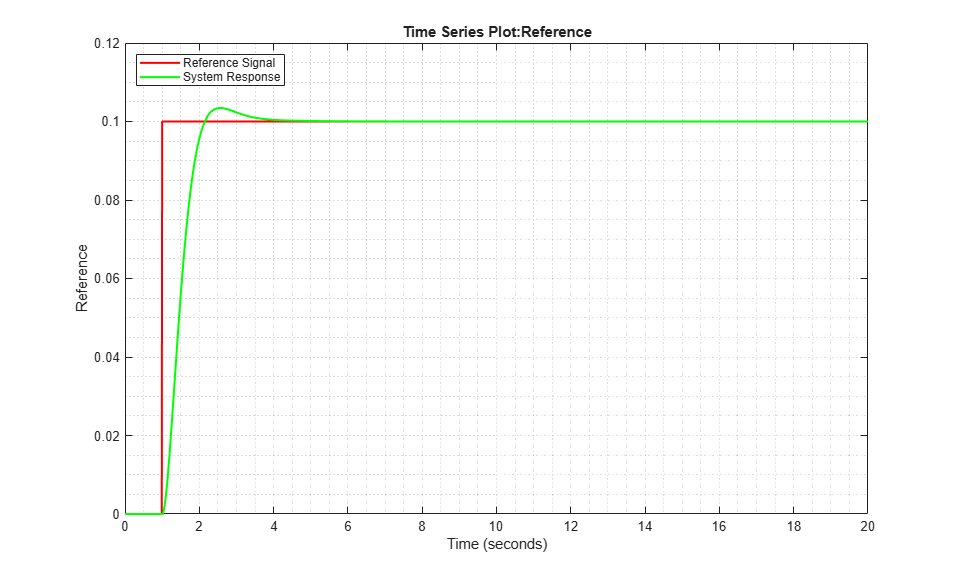 simInitial = Simulink.SimulationInput(model_for_sim); simInitial = setModelParameter(simInitial, 'SaveFinalState', 'on', 'SaveOperatingPoint', ... 'on','StartTime', '0', 'StopTime', int2str(sine_time)); initialSim = sim(simInitial); plotData = figure(1); plotData.Name = "System Response"; plot(initialSim.yout{2}.Values, 'r', 'LineWidth', 1.5); hold on; plot(initialSim.yout{1}.Values, 'g', 'LineWidth', 1.5); hold on; legend('Reference Signal', 'System Response','Location', 'northwest'); grid minor;
