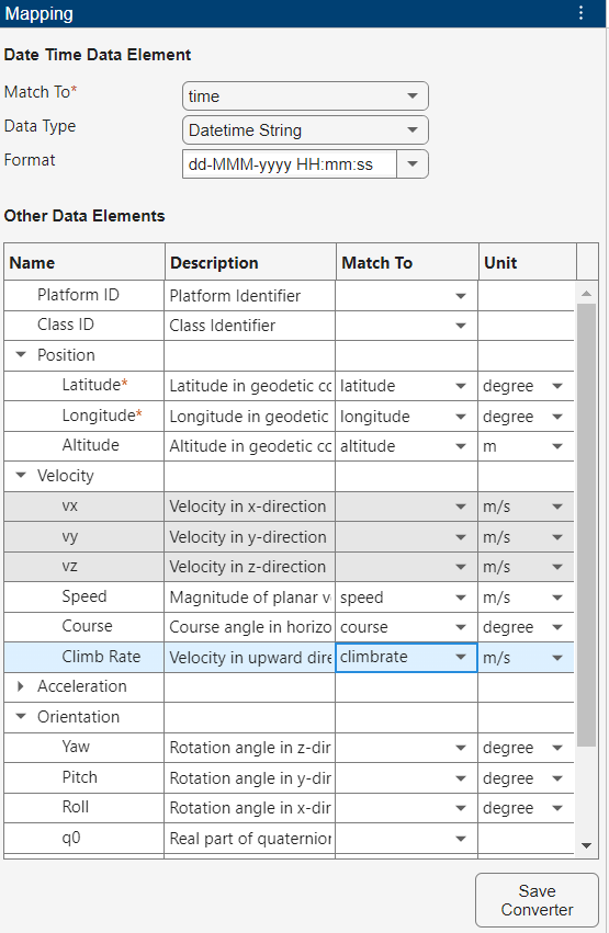 The mapping of other data elements is straightforward. Simply match columns in the imported table with the corresponding data elements. After that, select the unit of the matched column. For example, match the altitude column to the Altitude data element and set its unit to ft. After you map all the required elements (Data Time, Latitude, and Longitude in the case of this example), the app enables the Convert button in the toolstrip. You can also click the Save Converter button to save the current converter for reusing it in this or other sessions of the app.
