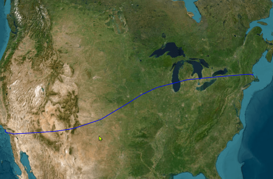 After the conversion, you can optionally visualize the truth data on a map. Click the Visualize button in the toolstrip and the app displays the trajectory from Los Angeles to Boston on the globe. You can change camera direction and height of the view by using your mouse.