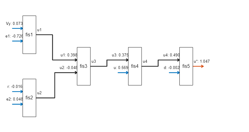 • The first layer uses two FISs: fis1 and fis2, where fis1 combines lateral velocity (Vy) and lateral deviation (e1), and fis2 combines yaw angle (r) and relative yaw angle (e2) to predict expected steering angles u1 and u2 for the respective input values.
