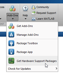 1. On the MATLAB® Home tab, in the Environment section, select Add-Ons > Get Hardware Support Packages.
