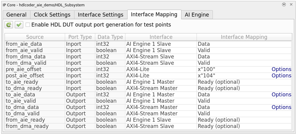 button to compile the model and repopulate the DUT ports and their data types.Assign DUT ports to their interfaces as shown in the table: