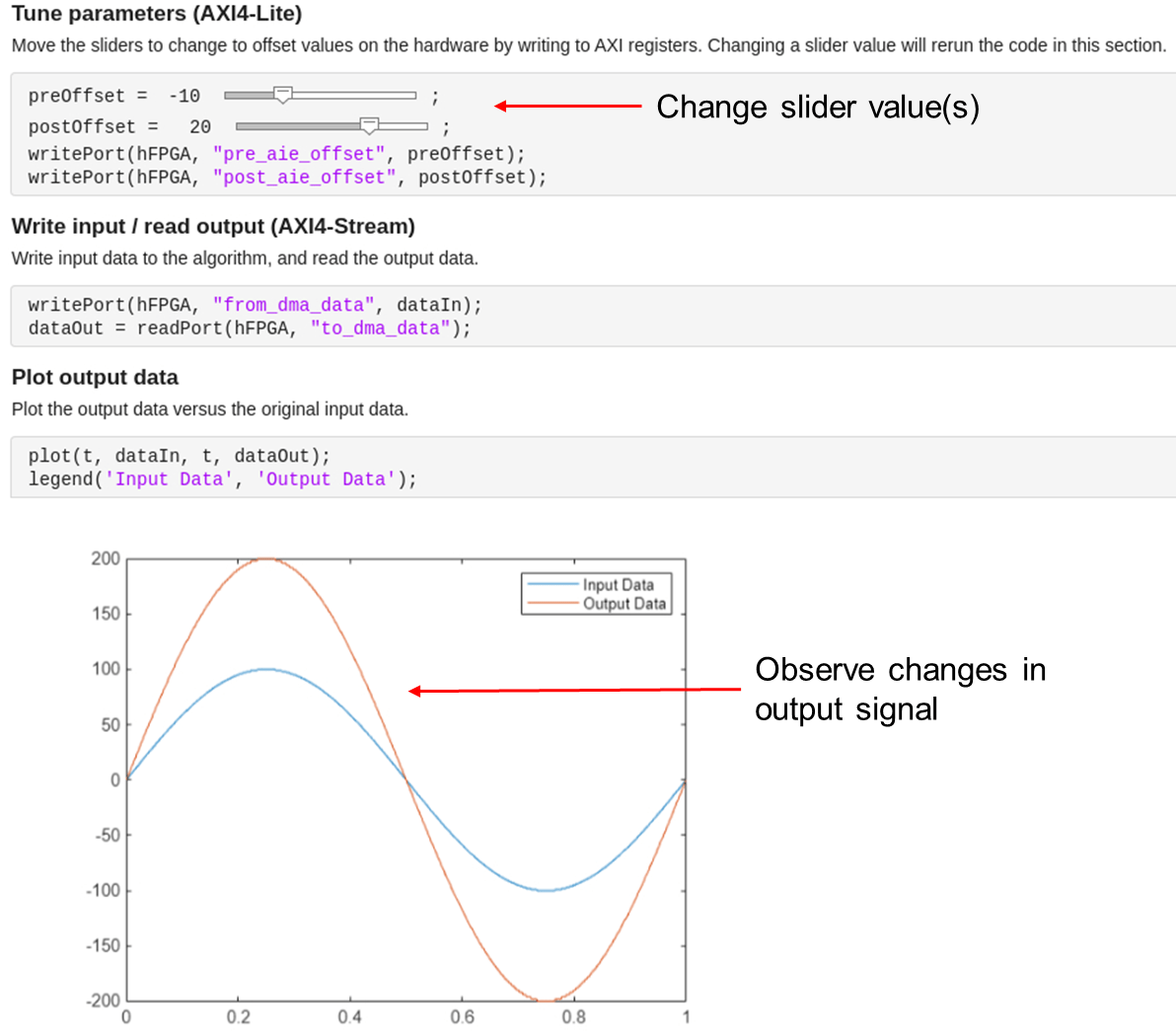 open hdlcoder_aie_demo_script.mlxThis script deploys the design on the hardware, then provides interactive controls and commands that you can use to tune parameters, write input data to the hardware, and plot the output result from the algorithm.