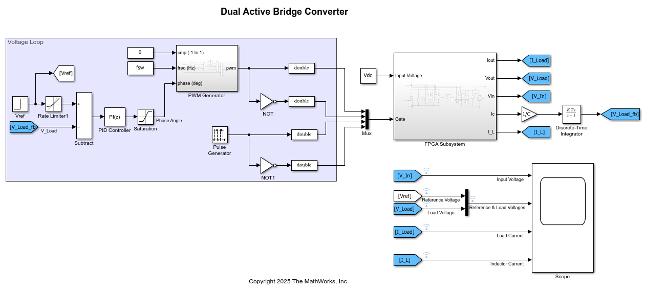 This example shows how to model a dual active bridge (DAB) converter with two full-bridges and control the output voltage of the circuit. The converter is modeled using the dynamic switch approximation method. You can generate HDL code for the model, synthesize the code, and deploy it onto target hardware.