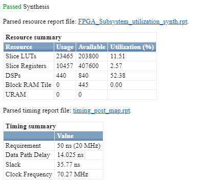 5. Generate the HDL code and synthesize the results. Open the HDL Workflow Advisor for the FPGA Subsystem block of the HDL implementation model.