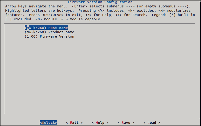 3. In the Firmware Version Configuration setting, set the Host name and Product name, properties. The host name and product name appear in the Linux console when you boot the board. For example, in this image, the host name and product name are mw-kr260.