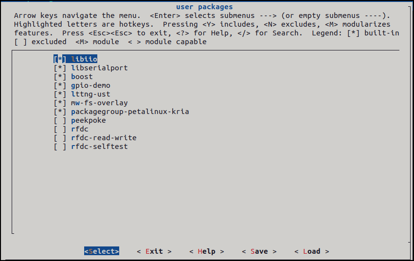 To view the packages, navigate to the User packages settings. Select all of the packages you copied in step 2, then save and exit the configuration menu. You can follow the same process to add your own custom packages. You can also include other packages in your ROOTFS by choosing packages under the Filesystem Packages and PetaLinux Package Groups menu options.