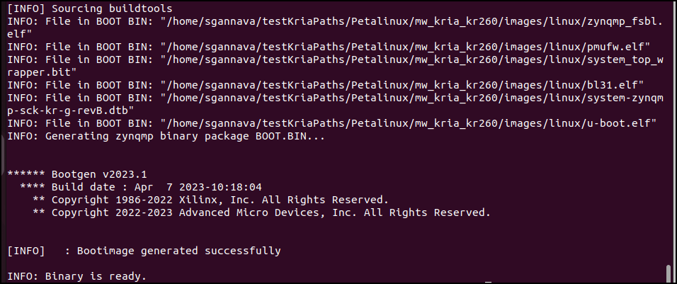 When the build completes, you can see the Linux binaries in the images/Linux folder. You can package the the boot image into a BOOT.BIN file by running this command.