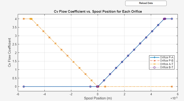 To visualize the spool offsets and maximum displacement, right-click the block and select Fluids > Plot Valve Characteristics. The plot shows the sonic conductance, Kv flow coefficient, Cv flow coefficient, or orifice area as a function of spool position.