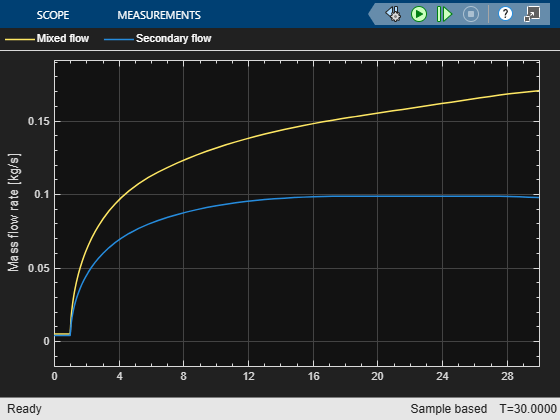 This example shows the mass flow rate of the primary and secondary flows through the Ejector (MA) block.