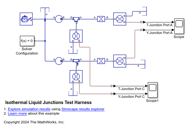 This example uses a test harness to compare the T-Junction (IL) and Y-Junction (IL) block behavior. A test harness is a minimally viable model that you can use to parameterize blocks or isolate dynamics.