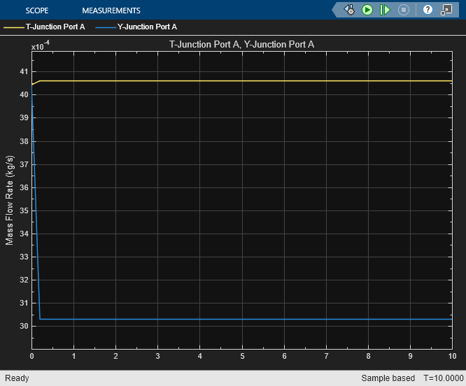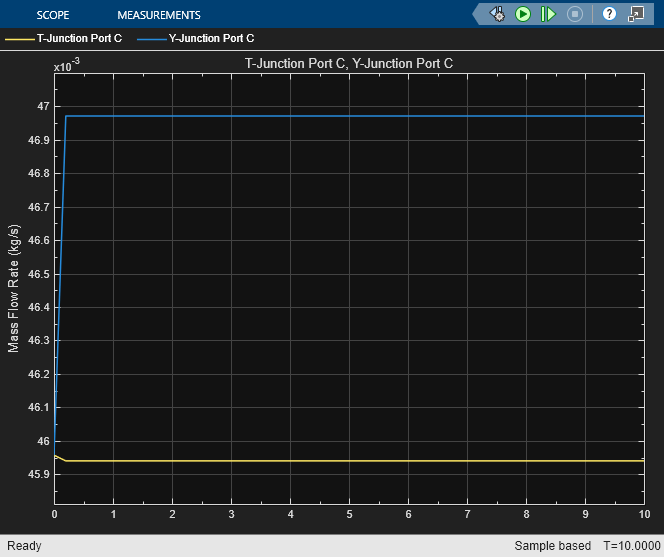 This figure shows the mass flow rate leaving from ports A and C in both blocks. The same mass flow rate that enters both blocks at port B, but in the T-Junction (IL) block, a greater portion of the flow rate exits at port A, and only a small portion exits at port C. In the Y-Junction (IL) block, a larger share of the flow that enters the block exits at port C. This is because port C leaves the main flow at an angle of 45 degrees, which is a more gradual direction change for the fluid than in the T-Junction.