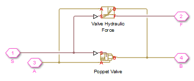The following example shows a model of a poppet valve built of a Poppet Valve block and a Valve Hydraulic Force block. The Valve Hydraulic Force block is connected in parallel and provides tabulated data to compute hydraulic force acting on the valve. The force value is exported through the F port.