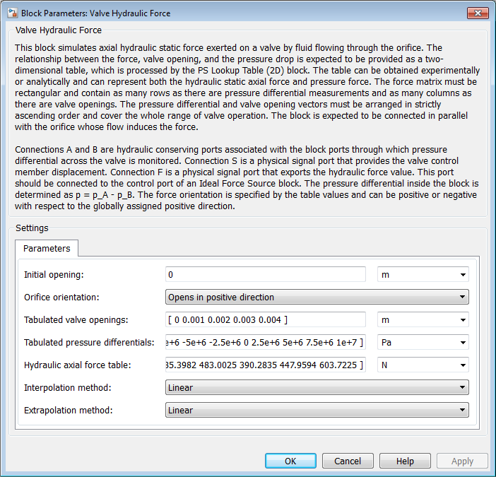 Connections A and B are hydraulic conserving ports that should be connected to the valve block ports in such a way as to monitor the pressure differential across the valve. Connection S is a physical signal port that provides the valve control member displacement. Connection F is a physical signal port that outputs the hydraulic axial force value. This port should be connected to the control port of an Ideal Force Source block. The pressure differential inside the block is determined as Δp=pApB,. The force orientation is specified by the table values and can be positive or negative with respect to the globally assigned positive direction, depending on the value of the Orifice orientation parameter.