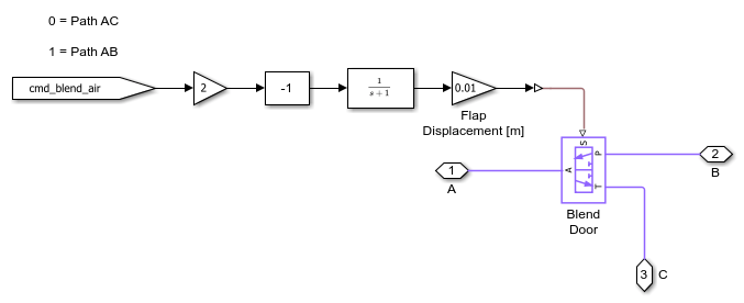 The blend door is modeled as two restrictions operating in the opposite manner. In cold loop mode, the two blend doors direct cabin air to pass through the evaporator and bypass the inner condenser. In heat pump mode, the two blend doors direct cabin air to pass through the inner condenser and bypass the evaporator.