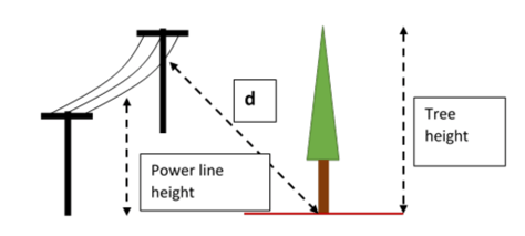 With the locations of the power lines and the individual trees, you can identify the risk trees. If the height of the tree is greater than d, where d is the distance from the powerline to the bottom of the tree, then classify it as a risk tree [3][5].