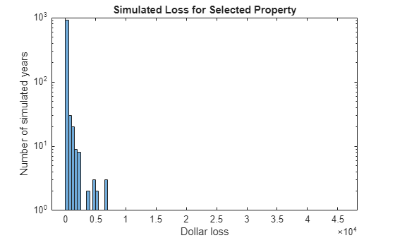 figure histogram(dollarLosses) title("Simulated Loss for Selected Property") ylabel("Number of simulated years") xlabel("Dollar loss") yscale log