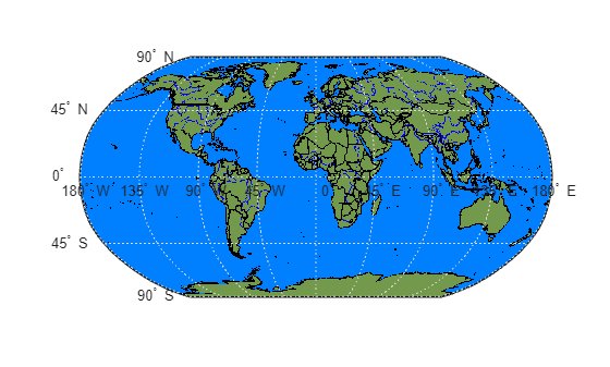 geoshow(A,R,DisplayType="texturemap")Apply a colormap that uses green for the land areas, black for the boundaries, blue for the rivers, and light blue for the ocean.