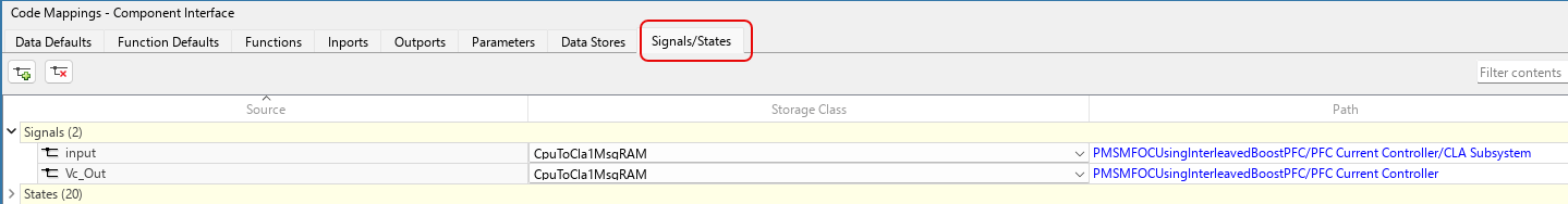The signals/states/data stores required to be stored in the CLA memory space is done with the help of the Code Mappings - Component Interface of the Embedded Coder dictionary. The following image shows the elements in the model configured in CLA memory space.