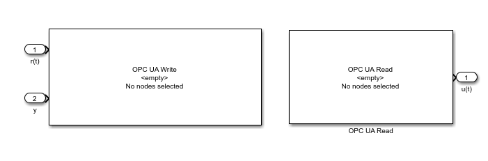 • In the plc_cosim_rt model, add rt and y to the OPC UA Write block, and ut to the OPC UA Read block. Ensure that the CODESYS SoftPLC is running the plc_cosim_rt project.