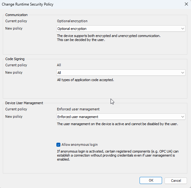 8. Log in to the device by navigating to Online > Login in CODESYS. If you are logging in for the first time, set up your user name and password. If you are an existing user, then enter your login credentials and then navigate to Device > Change Runtime Security Policy and select Allow anonymous login. Click OK.