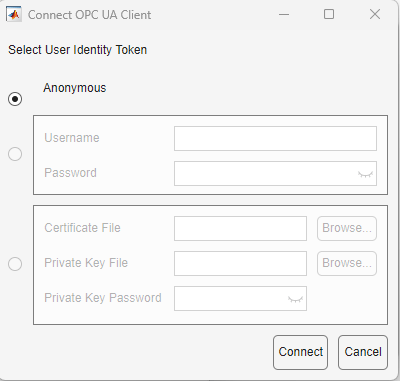 3. Open the plc_cosim_rt Simulink model and connect to the OPC UA server by clicking Model Settings > OPC Configuration. Select your OPC UA server and click Connect. Select Anonymous and click Connect.
