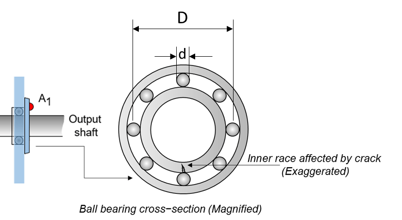 The following figure shows a rolling element striking a local fault at the inner race. A common problem is detecting and identifying these faults.