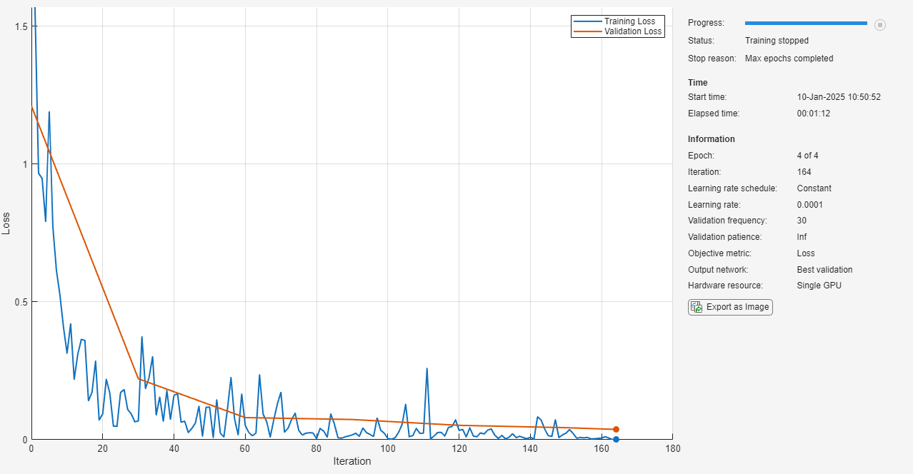 When you train the network multiple times, you might see some variation in accuracy between trainings, but the average accuracy should be around 98%. Even though the training set is quite small, this example benefits from transfer learning and achieves good accuracy.