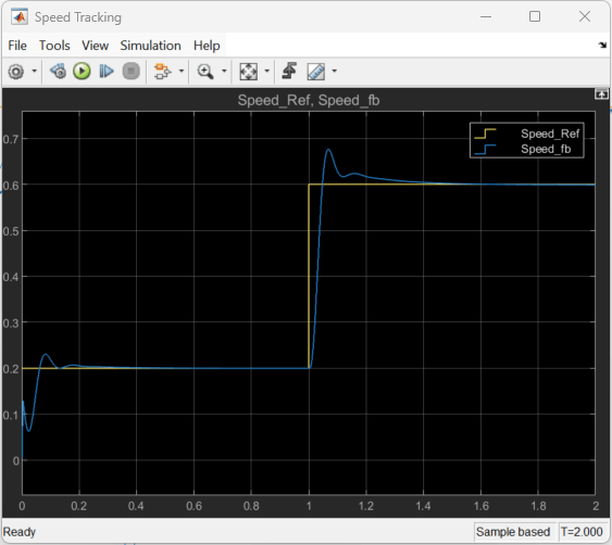 The following figure shows an example of closed-loop tracking performance. In this simulation, the reference speed steps through values of 695.4 rpm (0.2 per-unit) and 1738.5 rpm (0.5 pu). The PI and reinforcement learning controllers track the reference signal changes within 0.5 seconds.