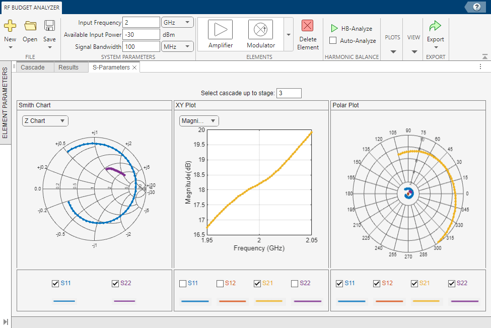 Select S-Parameters Plot button from the Plots section. This allows you to plot Smith® chart, polar plot, magnitude, phase and real, and imaginary parts of S-parameters of the RF System and over stages. Specify 3 in the Select cascade up to stage parameter.