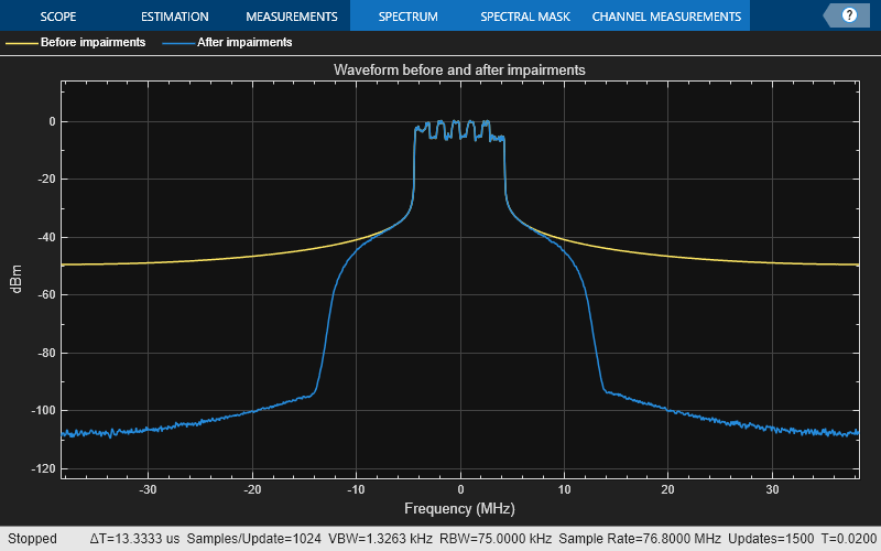 scope = spectrumAnalyzer('SampleRate',sr,... 'ChannelNames',{'Before impairments','After impairments'},... 'Title', 'Waveform before and after impairments'); scope([(1/peakPower).*txWaveform,rxWaveform]); release(scope);