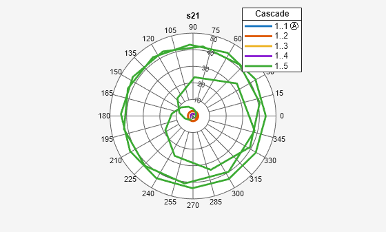 Use the RF budget smithplot/polar function to produce plots of cumulative RF budget sparameter results versus a range of cascade input frequencies. Use smithplot function to view reflection coefficients and polar to view reflection and transmission coefficients.