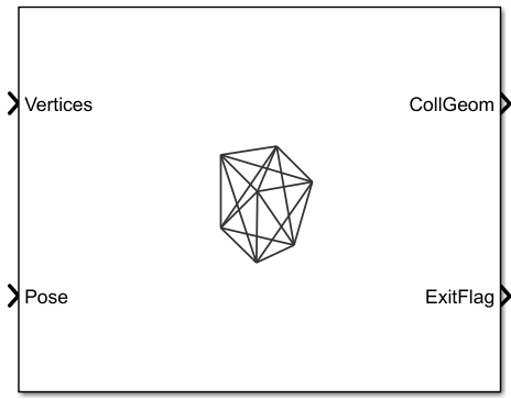 The Collision Mesh block outputs a convex mesh collision geometry using a list of 3-D vertices relative to a pose specified in relation to the world frame.