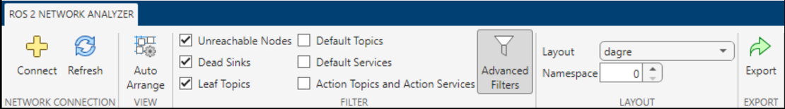 - Open ROS 2 Network Analyzer app from the Apps tab in MATLAB® toolstrip.